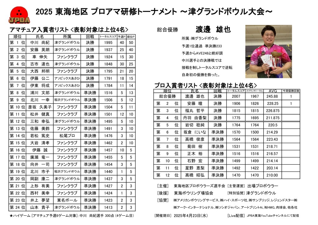 2025/4/23 津グランドボウル大会 投稿者:jpbatokai2025年4月25日2025年4月30日カテゴリー:プロアマ研修トーナメント結果 プロの部 アマチュアの部 総合優勝・渡邊雄也 ベストアマ・中川選手は見事パーフェクト達成 総合優勝・渡邊雄也による締めのご挨拶。意外や意外、この大会は初優勝だったとの事 共有: X で共有 (新しいウィンドウで開きます) X Facebook で共有 (新しいウィンドウで開きます) Facebook いいね 読み込み中… 関連
