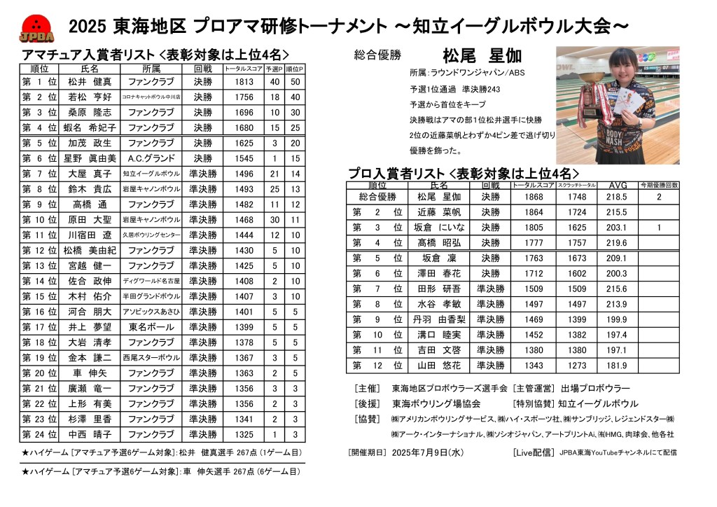 2025/7/9 知立イーグルボウル大会 投稿者:jpbatokai2025年7月12日2025年8月4日カテゴリー:プロアマ研修トーナメント結果 プロの部 アマチュアの部 総合優勝・松尾星伽 ベストアマ・松井健真選手 共有: X で共有 (新しいウィンドウで開きます) X Facebook で共有 (新しいウィンドウで開きます) Facebook いいね 読み込み中… 関連